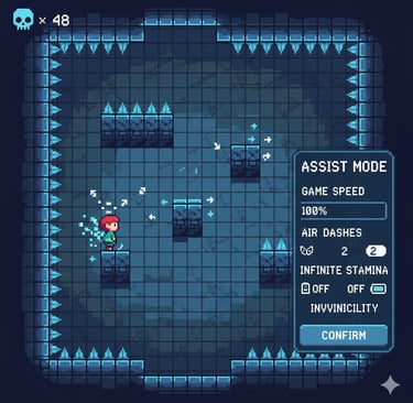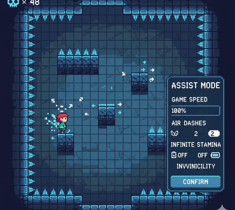 Figure 3. Repeated deaths and the optional Assist Mode show difficulty as practice and self-care rather than punishment (Celeste, 2018).